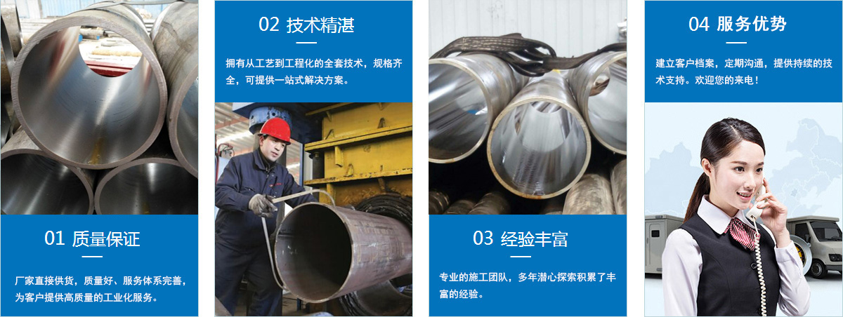 目前公司品種規(guī)格為:內(nèi)徑直徑30mm—300mm,壁厚為2mm—40mm。技術(shù)條件為:內(nèi)孔精度H5—H10,內(nèi)孔粗糙度Ra≤0.63um,直線度≤0.3mm/m。鋼號是20#—45#、16Mn、27SiMn及部分低合金鋼,標準GB8713-88。規(guī)格為40-300*2-40MM,長度為2-12M的各種類型油缸管,年產(chǎn)銷售能力3萬噸。公司設(shè)備先進,工藝優(yōu)化,檢測手段完善。